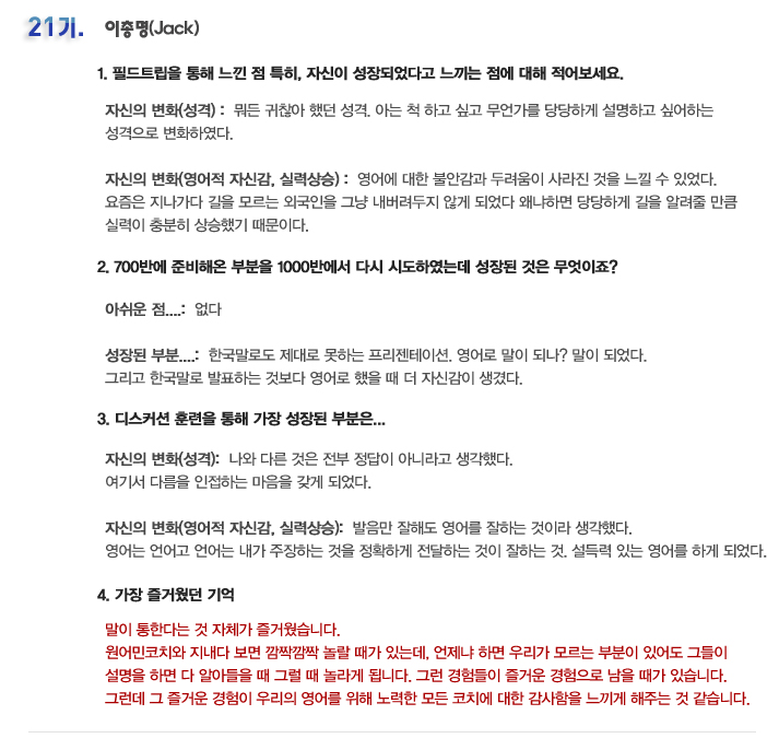 국내 집중 어학연수 21기 이총명 6개월의 변화과정