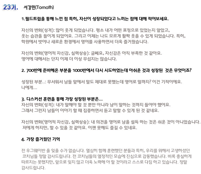 국내 집중 어학연수 23기 서강민 6개월의 변화과정