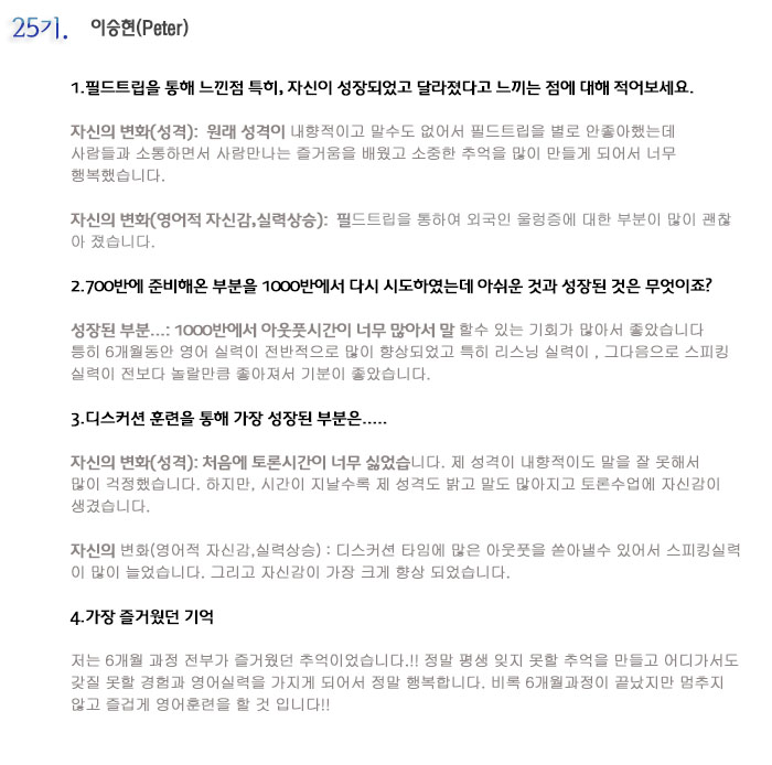 단기 집중 국내 어학연수 25기 이승현 6개월의 변화과정